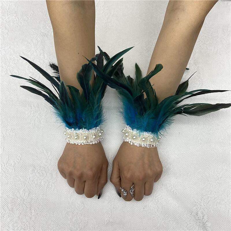 Carnival 2026Rio Carnival Samba Accessories Women's Green Feather Wrist Cuffs with White Pearl Lace Brazil Festival Performance Costume