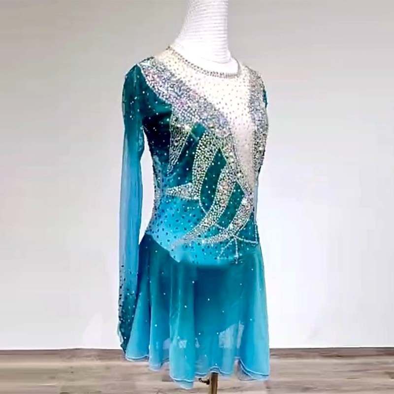 Figure Skating Dress Women's Girls' Ice Skating Dress Blue White High Elasticity Training Competition Skating Wear Classic Crystal / Rhinestone Long Sleeve Ice Skating Figure Skating