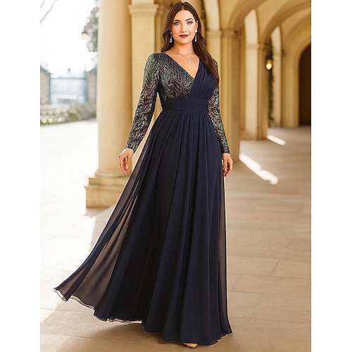 Abito da ospite per matrimoni in stile A-Line fino al pavimento Abiti formali Abito da sera Abito per la madre della sposa maniche lunghe scollo a V elegante vintage taglie forti paillettes con