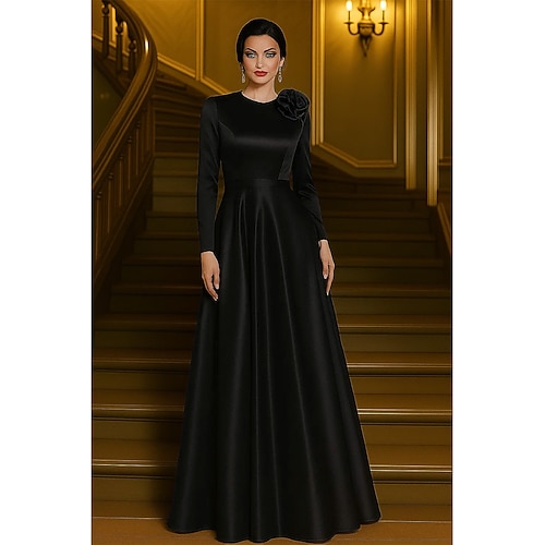 Abito da sera A-Line rosso elegante formale lungo fino al pavimento con maniche lunghe scollo a girocollo in satin stretch con fiore sulla spalla