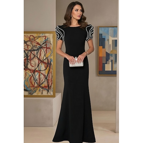Abito a-line lungo fino al pavimento abito formale abito da sera abito da sera elegante vintage abito nero maniche corte scollo tondo matrimonio San Valentino senza schiena con rouches