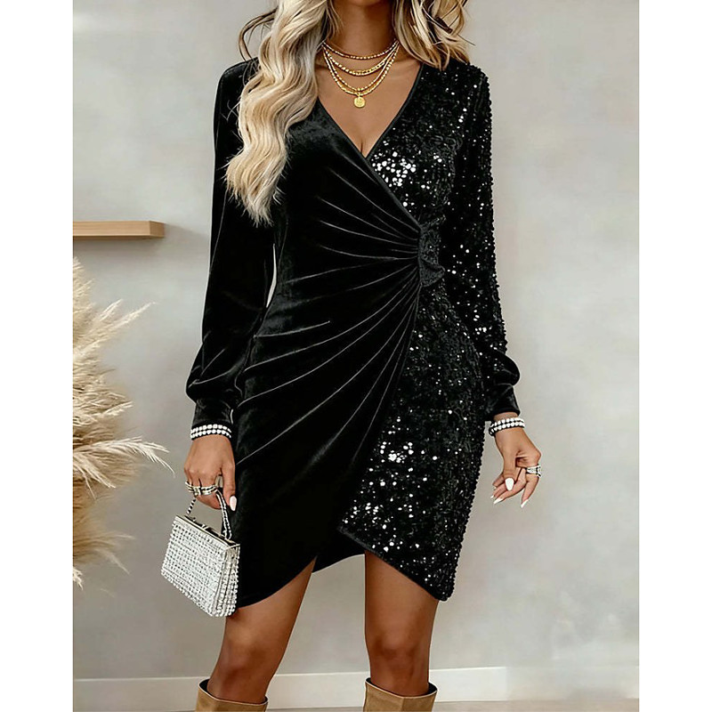 New Year Women's Mini Dress Sheath Dress Elegant Party Birthday Vacation Party Wedding Solid Color Long Sleeve V Neck Wine Red Black Gold Winter