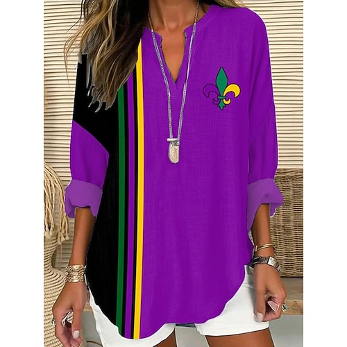 Blusa da Donna per il Mardi Gras in Lino Leggero Traspirante Grafica Vintage Stile Quotidiano Manica Lunga Collo a V Normale Top Quotidiani Stampa Gialla Viola Verde Estate Primavera