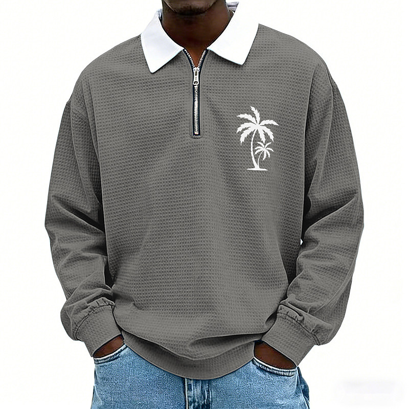 Men's Waffle Polo Shirts Polo Vacation Street Quarter Zip Long Sleeve Fashion Basic Color Block Coconut Tree Patchwork Spring Fall Regular Fit Black Army Green Purple khaki Grey Light Blue Waffle
