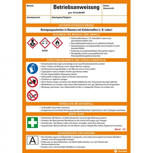 Betriebsanweisung Reinigungsarbeiten in..., CLP/GHS, Kunststoff, 210x297mm, ASR A1.3, DIN EN ISO 7010
