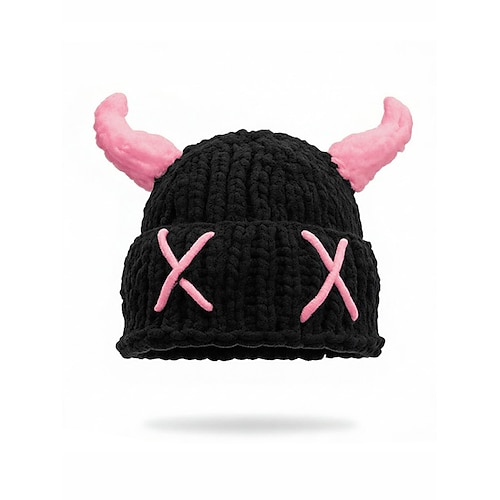 berretto da donna in lana lavorata a maglia con corna, disponibile in più colori, perfetto per carnevale e feste in maschera