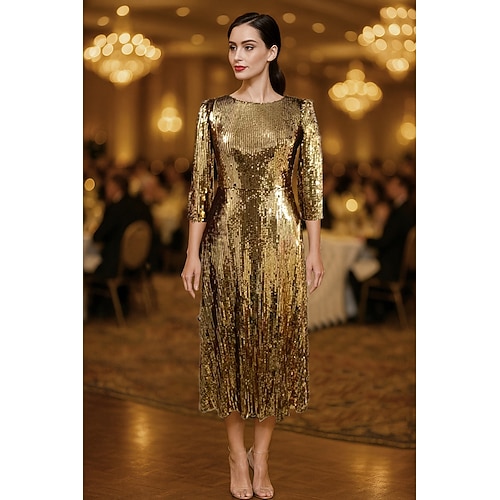 Abito da sera A-Line in oro con paillettes elegante abito formale da matrimonio lunghezza alla caviglia manica 3/4 collo rotondo tasca con pieghe