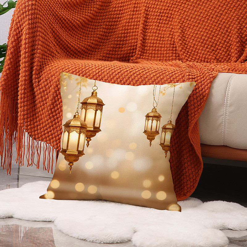 Ramadan Eid Throw Pillow Cover, Gold Crescent Moon Oil Lamp Print, Ethnic Festival Decor, Sofa Cushion for Living Room and Prayer Room, Holiday Accent Pillow