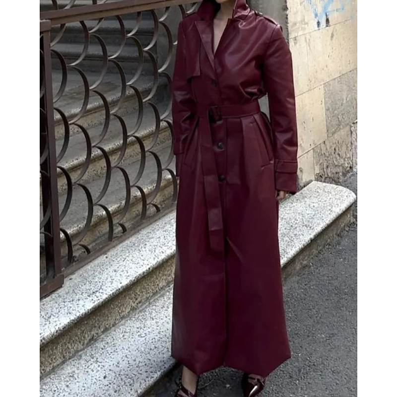 Women's Faux Leather Jacket Trench Coat Leather Trench Coat Warm Comfortable Pocket Buttons Fashion Plain Formal Outdoor Vacation Casual Long Turndown Regular Fit Long Sleeve Outerwear Black Drak Red