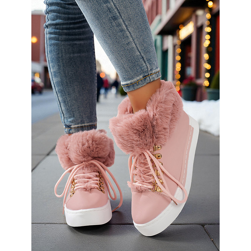 Women's Red Faux Fur Sneakers - Warm Winter Lace-Up Shoes with Plush Lining, Christmas Casual Footwear for Outdoor and Street Style Looks