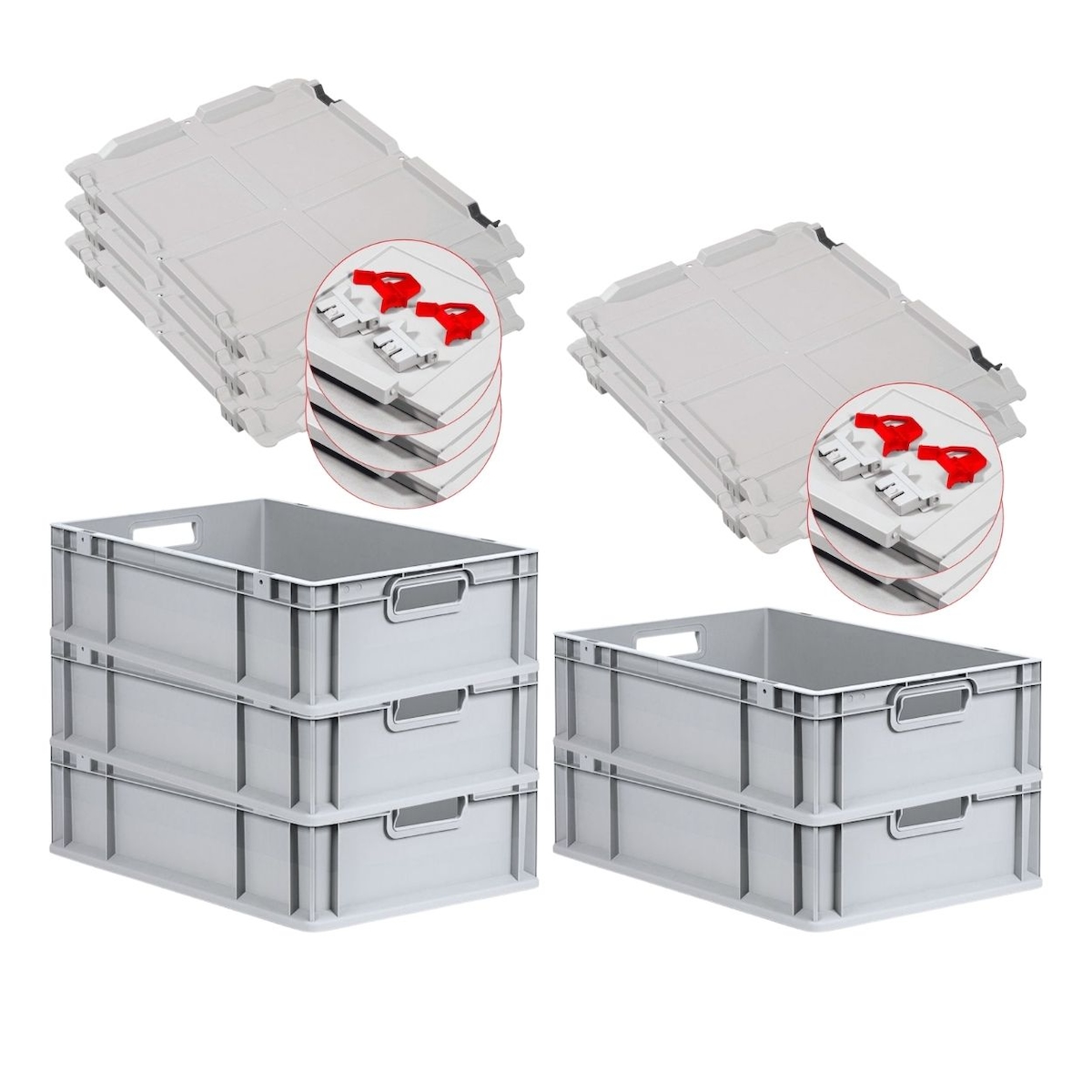 PROREGAL 5x Eurobehälter mit offenem Griff und Scharnierdeckel | HxBxT 17,5x40x60cm | 30 Liter | Grau | Eurobox