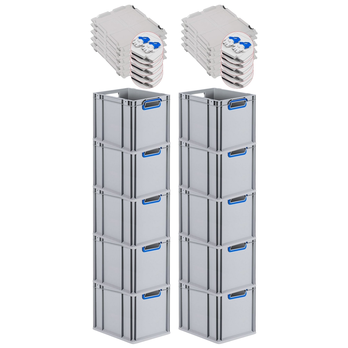 PROREGAL 10x Eurobox NextGen Grip mit Scharnierdeckel & gelben Verschlüssen | HxBxT 17x40x60cm | 34 Liter | Griffe offen | Glatter Boden