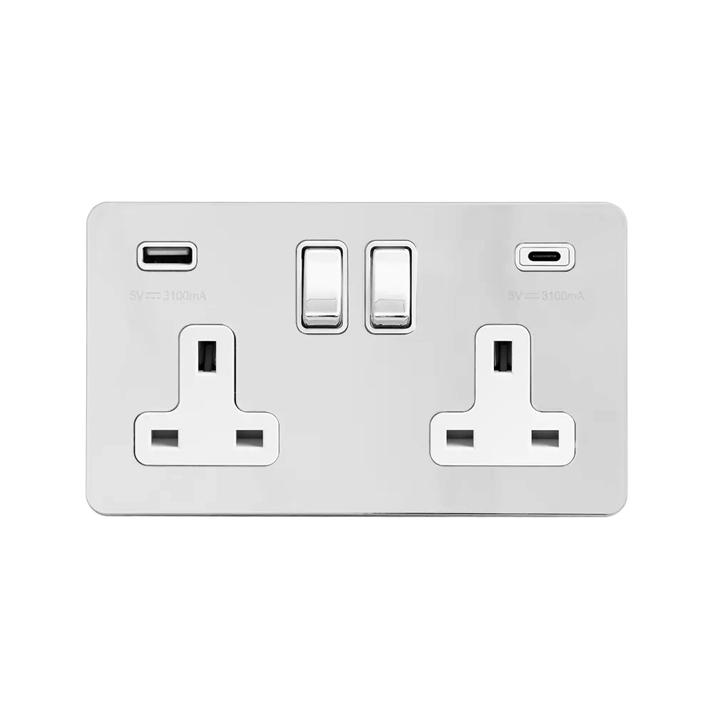 Soho Lighting Polished Chrome Flat Plate 2 Gang USB A+C Socket (13A Socket + 2 USB Ports A+C 3.1A)