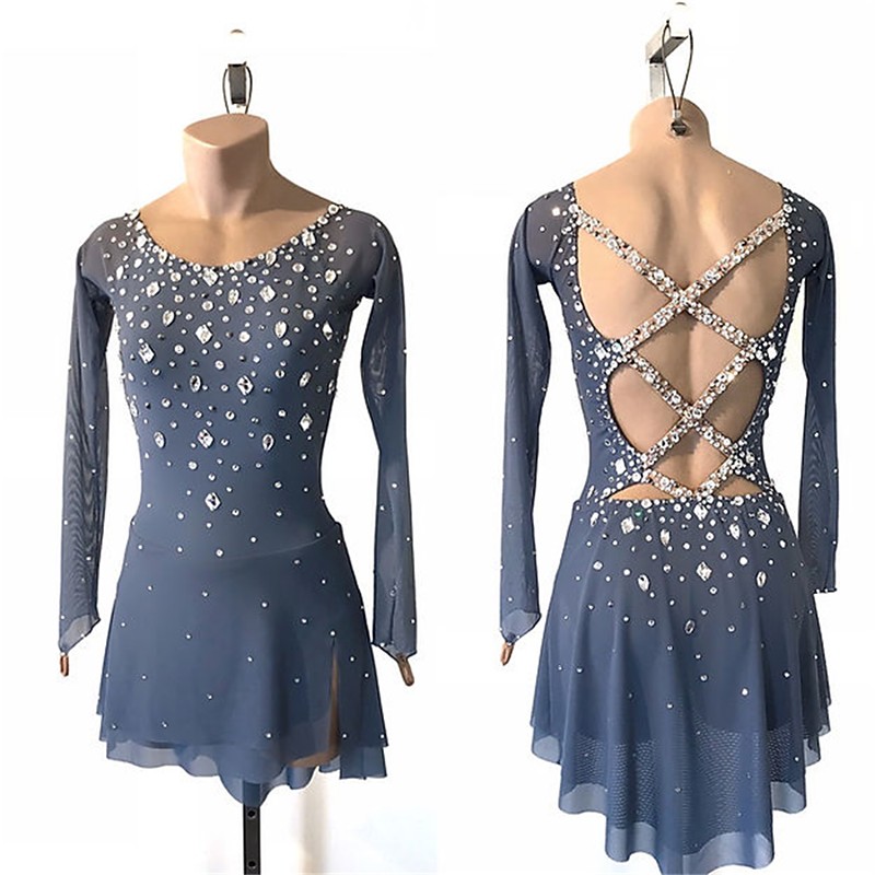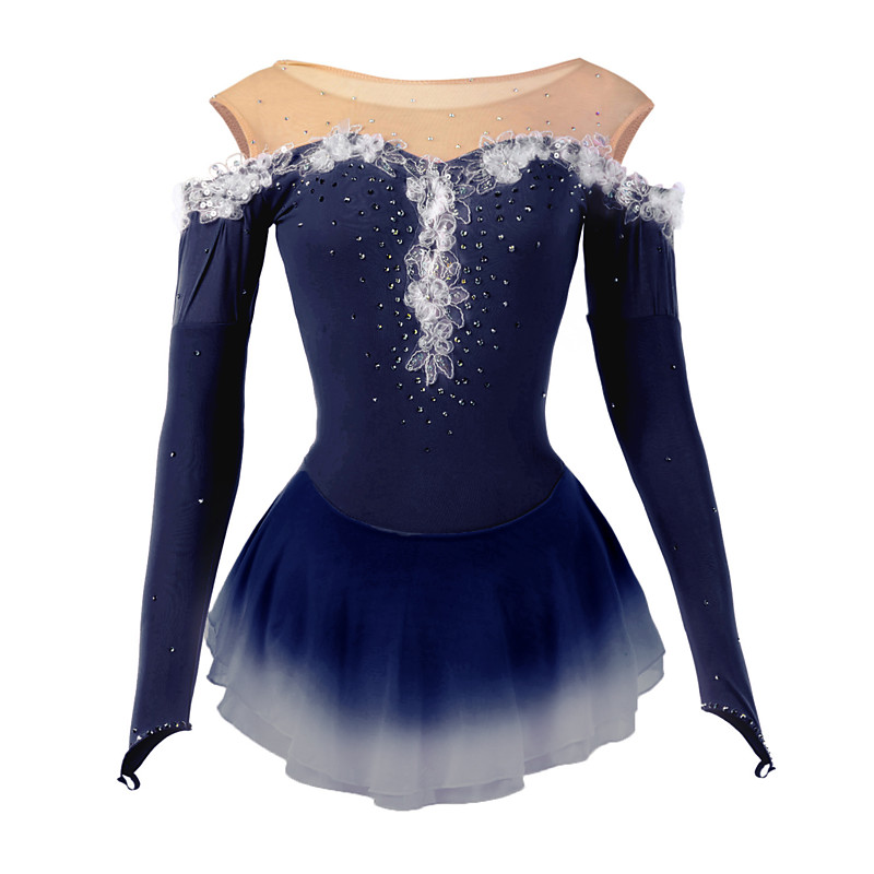 Figure Skating Dress Women's Girls' Ice Skating Dress Navy White Pink Patchwork Open Back Mesh High Elasticity Training Competition Skating Wear Classic Crystal / Rhinestone Long Sleeve Ice Skating