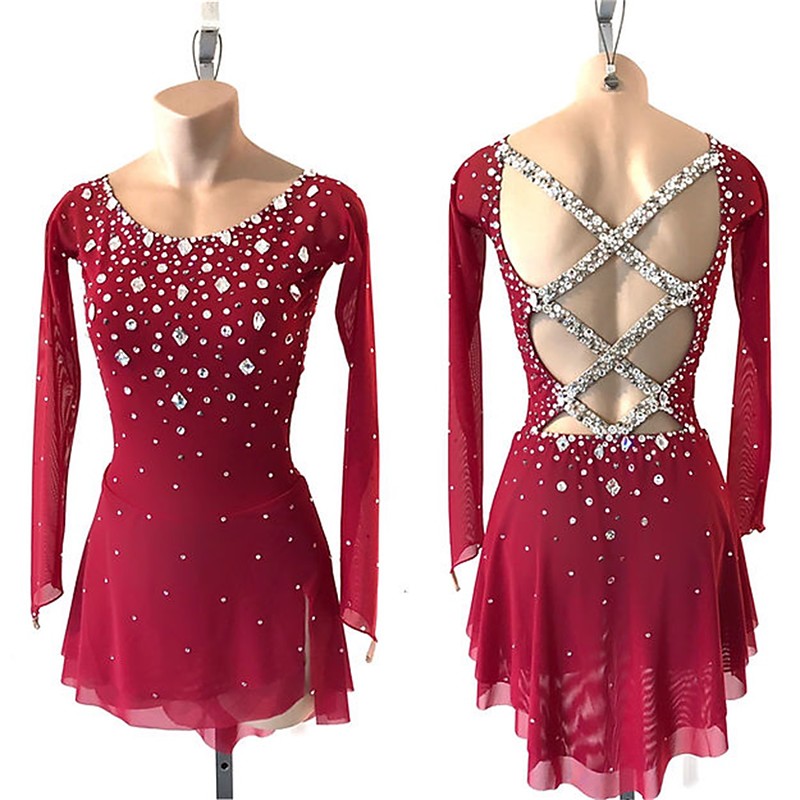 Figure Skating Dress Women's Girls' Ice Skating Dress Dark Pink Patchwork Thumbhole Mesh Spandex Stretchy Training Practice Professional Skating Wear Thermal Warm Crystal / Rhinestone Long Sleeve Ice
