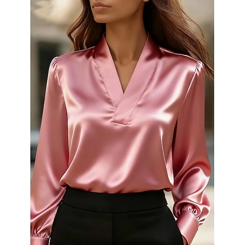 camicetta da donna in raso, tinta unita, elegante, alla moda, da lavoro, manica lunga, scollo a V, top normali, da lavoro quotidiano, in ufficio, nero, bianco, rosa, cachi, primavera, autunno