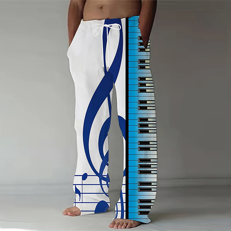 Men's Piano Musical Notes Swirl Trousers Baggy Pants Casual Pants Mid Waist Vintage Retro Outdoor Vacation Elastic Drawstring Waist Linen-Like Pants with Pockets Summer Spring 3D Print Black White