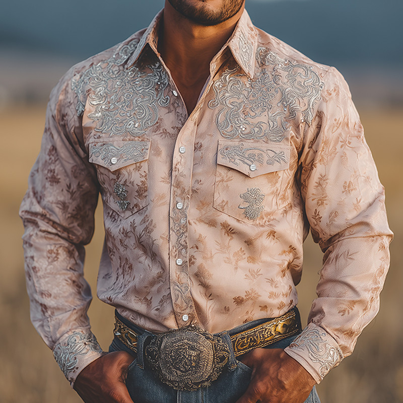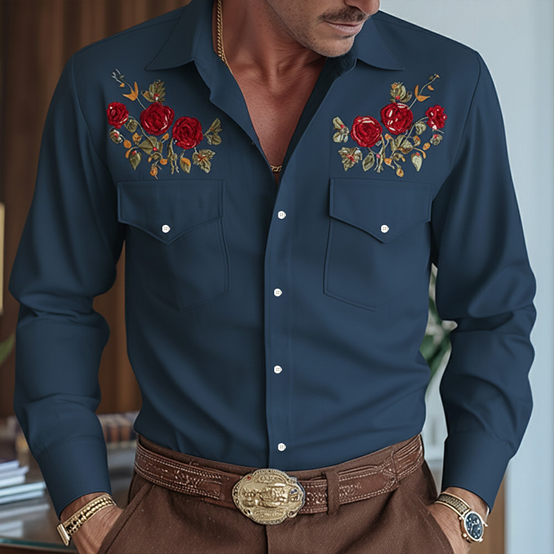 Men's Floral Print Ethnic Flowers Shirt Western Shirt Cowboy Shirt Long Sleeve Vintage Retro Outdoor Casual WorkWear Spring Fall Turndown Front Two Pockets Linen Like Shirt Button Up Shirts Blue