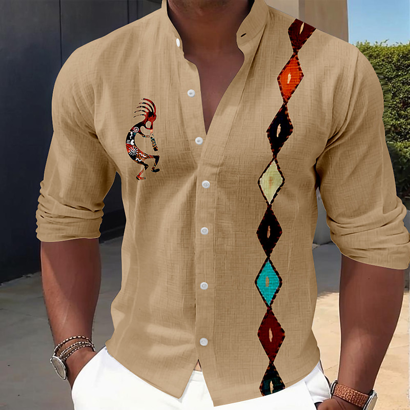 Men's Geometric Pattern Ethnic Indian Culture Shirt Button Up Shirt Stand Collar Shirt Long Sleeve Vintage Retro Daily Outdoor Vacation Spring Fall Mandarin Collar Band Collar 3D Print Linen Like
