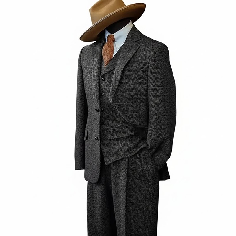 Men's Business Wedding Tweed Suits Notch Lapel Blue Light Khaki Business Retro Vintage Herringbone Tailored Fit 3 Piece Single Breasted Two-buttons
