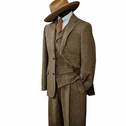 Herren Hochzeit Hochzeitsfeier Tweedanzüge Gekerbtes Revers Braun Hell Gray Retro Vintage Formell Fischgrätenmuster Standard Passform 3-teilig Einreihige Zwei-Knopf-Jacke