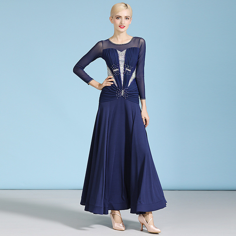 Women's Navy Blue Ballroom Dance Dress Rhinestone Beaded Ruched Bodice Sheer Mesh Long Sleeve Waltz Gown Modern Standard Competition Outfit