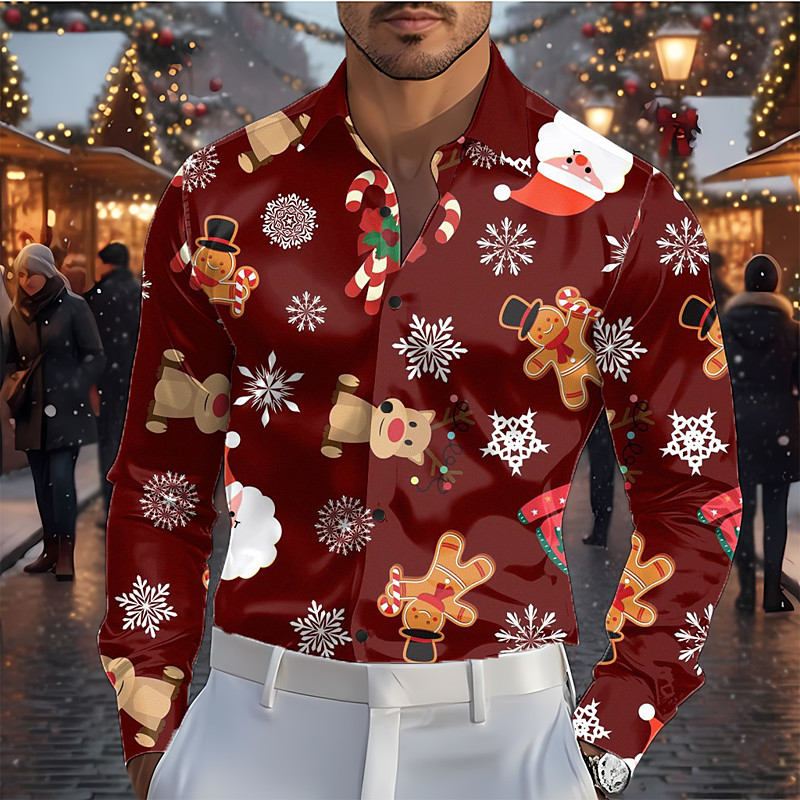 Christmas Men's Santa Claus Snowflake Gingerbread Man Shirt Satin Shirt Dress Shirt Long Sleeve Fashion Casual Outdoor Holiday Spring Fall Turndown 3D Print Button Up Shirts Burgundy Purple Dark Blue