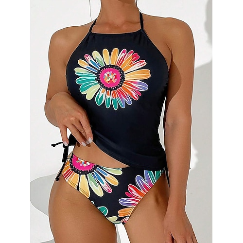 Per donna Tankini Costume da bagno a due pezzi Schiena scoperta Costumi da bagno Floreale Costumi da bagno Nero Giallo Traspirante Asciugatura rapida Leggero Senza maniche - Nuoto Surf Spiaggia