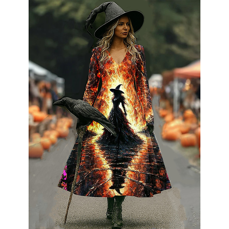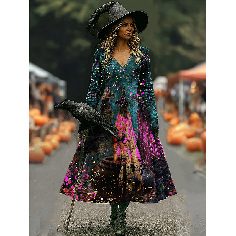 Women's Witch Print Maxi Dress A Line Dress Vacation Casual Boho Beach Regular Fit Floral Graphic Hocus Pocus Long Sleeve V Neck Yellow Dark Green Purple Orange Spring Fall