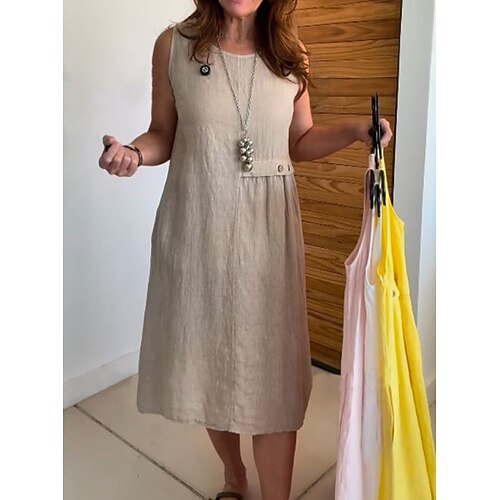 vestito midi da donna in cotone e lino, vestito a trapezio, vestito estivo, casual, da vacanza, quotidiano, vestibilità ampia, tinta unita, mezza manica, girocollo, azzurro, nero, bianco, verde,