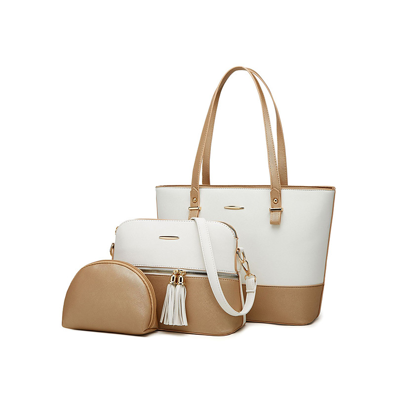 Elegant women's stylish two-tone patchwork handbag set with tassel decoration - handbag, crossbody bag and small bag - perfect for daily leisure, commuting to work