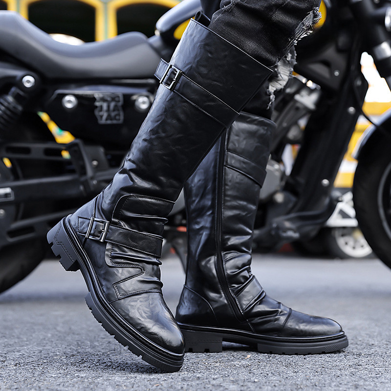 Men's Motorcycle Biker Boots Knee High Rugged Black Leather Winter Riding Shoes with Buckles