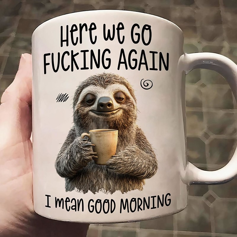 Funny Sloth Gift Mug Here We Go Fucking Again I Mean Good Morning Ceramic Coffee Cup for Work Office Home Humor Gift for Friends Coworkers