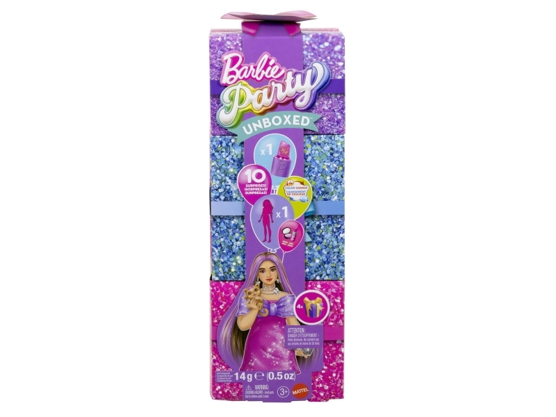 Barbie Party Unboxed Glam Party Series Pink Sparkle Doll & Accessories with 10 Surprises, Fashion doll, Female, 3 yr(s), Girl, 296 mm, 280 g