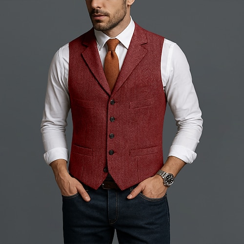 Per uomo Gilet in tweed Gilet Formale Matrimonio Vacanza Affari Punk Vintage Primavera Autunno Tasca Bottoni Poliestere Confortevole Spina di Pesce Monopetto Scollo a V Vestibilità aderente Nero Vino