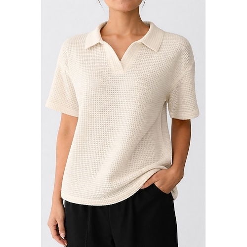 Per donna Maglietta Waffle Maglietta Traforato Tinta unica Elegante Moda Casual Manica Corta Scollo a V Colletto a Camicia Top Regolari Quotidiano Uscire Abbigliamento da vacanza Nero Bianco Cachi