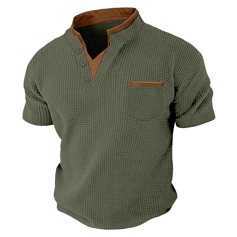 Men's Waffle Knit Tee Tee Top Short Sleeve V Neck Mandarin Collar Summer Spring All Seasons Solid Color Color Block Fashion Designer Casual Buttons Fake two piece Casual Daily Outdoor Light Blue Army