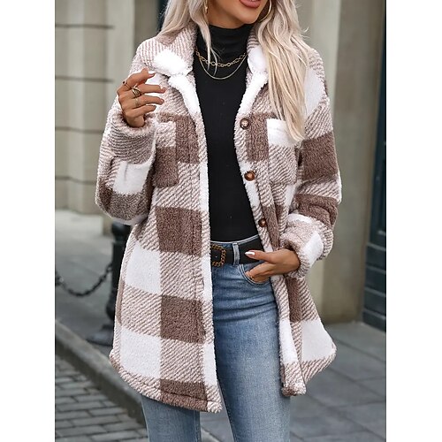 Per donna Giacca Sherpa Confortevole Traspirante Bottoni Elegante Casual Plaid Vacanza Streetwear Casuale Abbigliamento quotidiano Monopetto Regolare Collo ripiegato Vestibilità regolare Manica Lunga