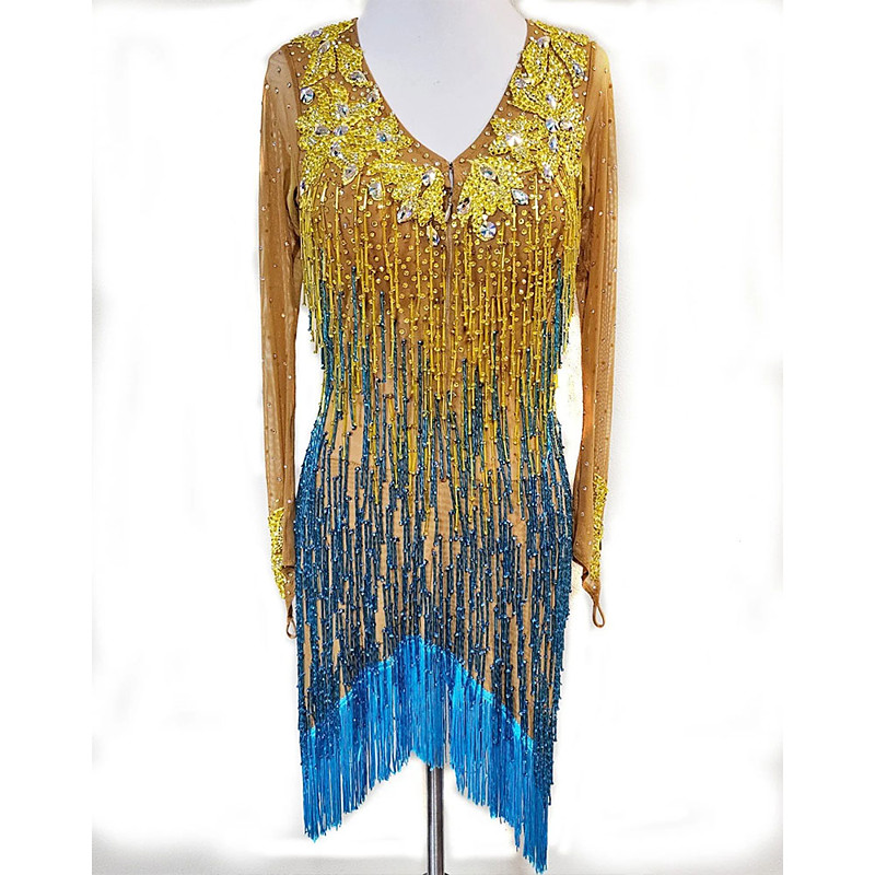 Women's Gold and Blue Latin Dance Dress with Crystal Rhinestones and Fringed Details for Salsa, Tango, and Dance Performance