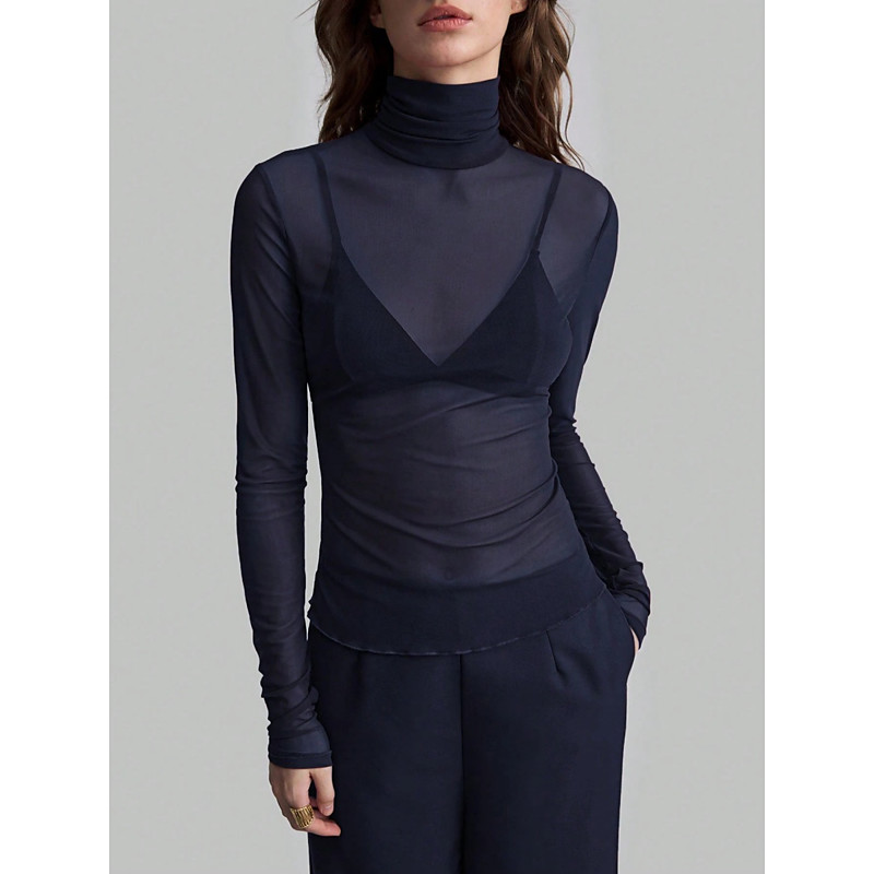 Women's Blouse Solid Color Elegant Stylish Basic Long Sleeve Turtleneck Regular Tops Daily Patchwork Mesh Sage Green Black Wine Navy Blue Brown Summer Spring Fall