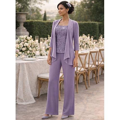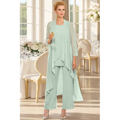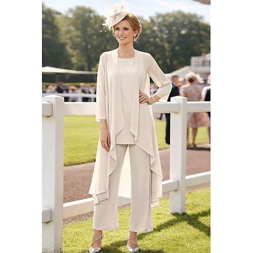 Tuta Completo Pantalone Tre Pezzi Lunghezza al pavimento Abito da cerimonia per signora Senza Maniche Scollo a Barca Elegante Taglie Forti Con Stola Ospite di nozze Chiffon Abiti con Giacca con Tinta