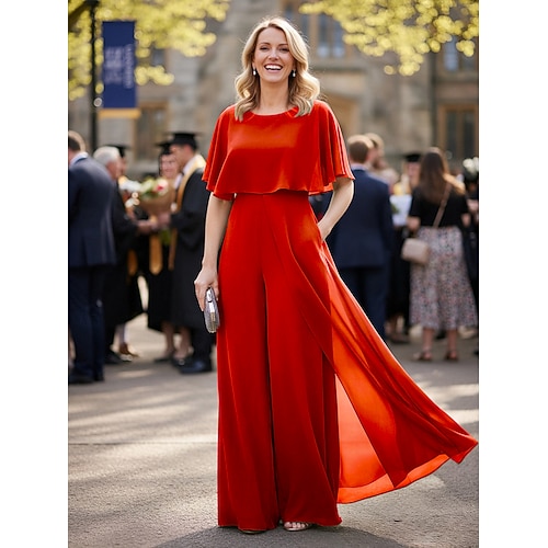 Tute Lunghezza al pavimento Abito da cerimonia per signora Manica Corta Girocollo Elegante Semplice Formale Ospite di nozze Chiffon con Tinta unita