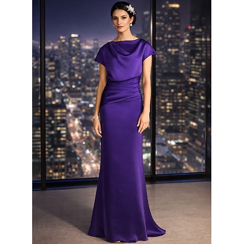 Tubino Colonna Abito Lunghezza al pavimento Abito da invitata a nozze Abito Formale Abito da sera Abito da cerimonia per signora Manica Corta Senza Spalle Elegante Formale Raso con Arricciato Tinta