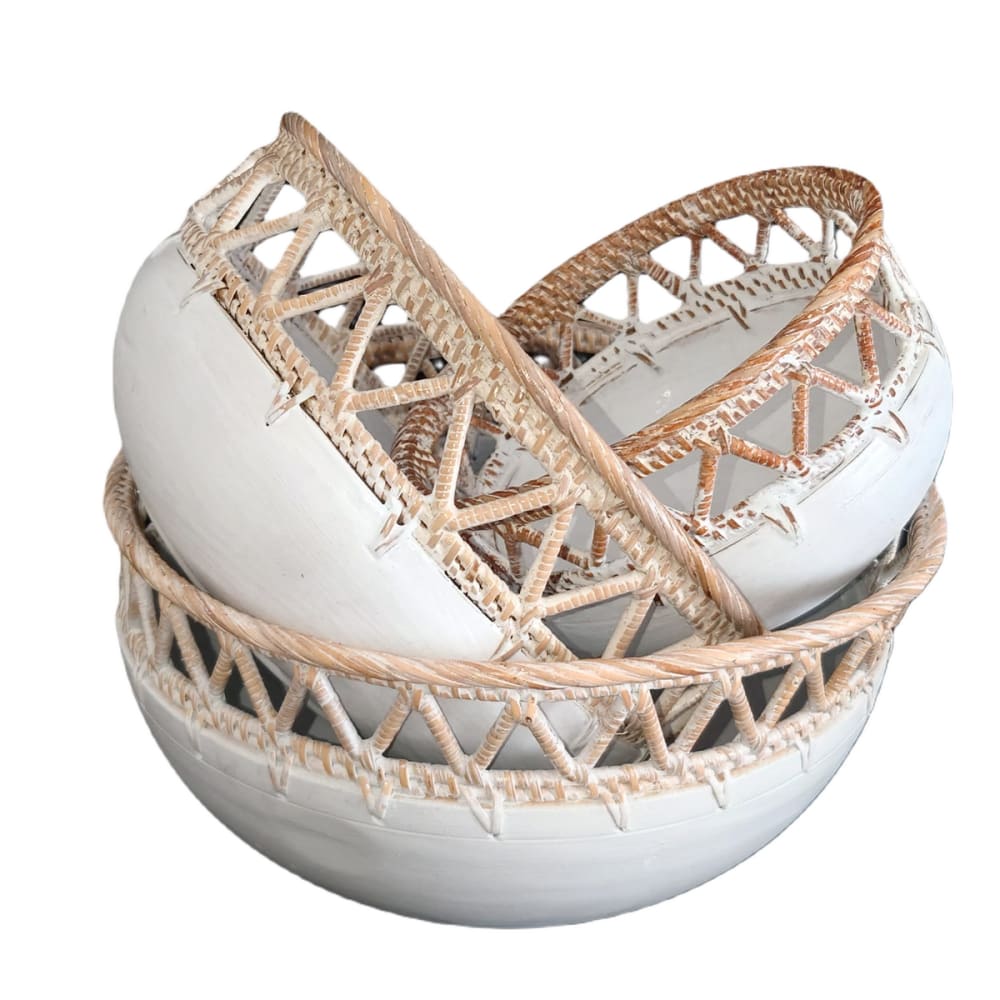 Ciotola rotonda in legno e rattan, bianco Set di 3