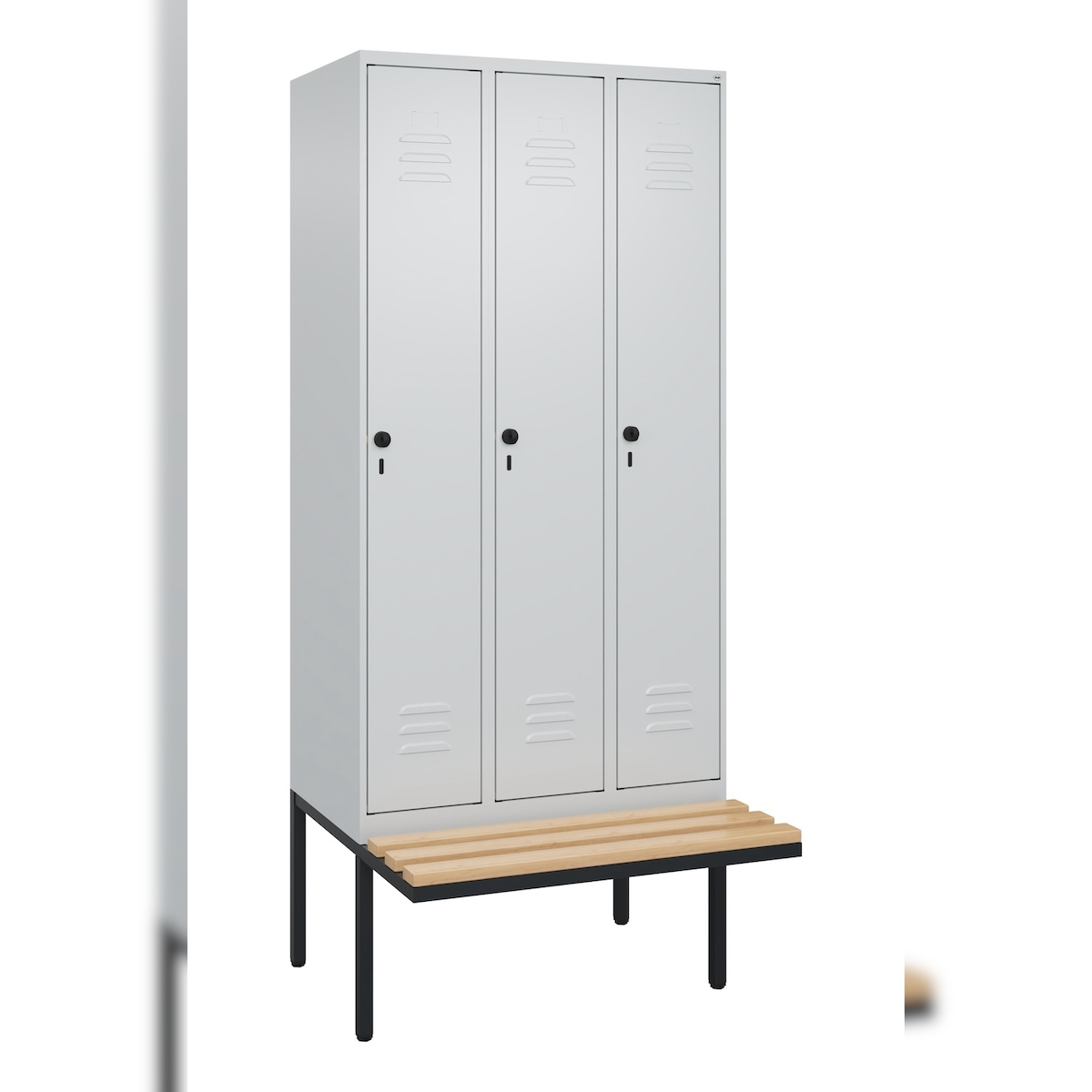C+P Spind Classic PLUS, schwebender Sitzbank aus Buche 3 Abteile, HxBxT 212x90x82cm, Sicherheitsdrehriegel, Hellgrau/Hellgrau von PROREGAL