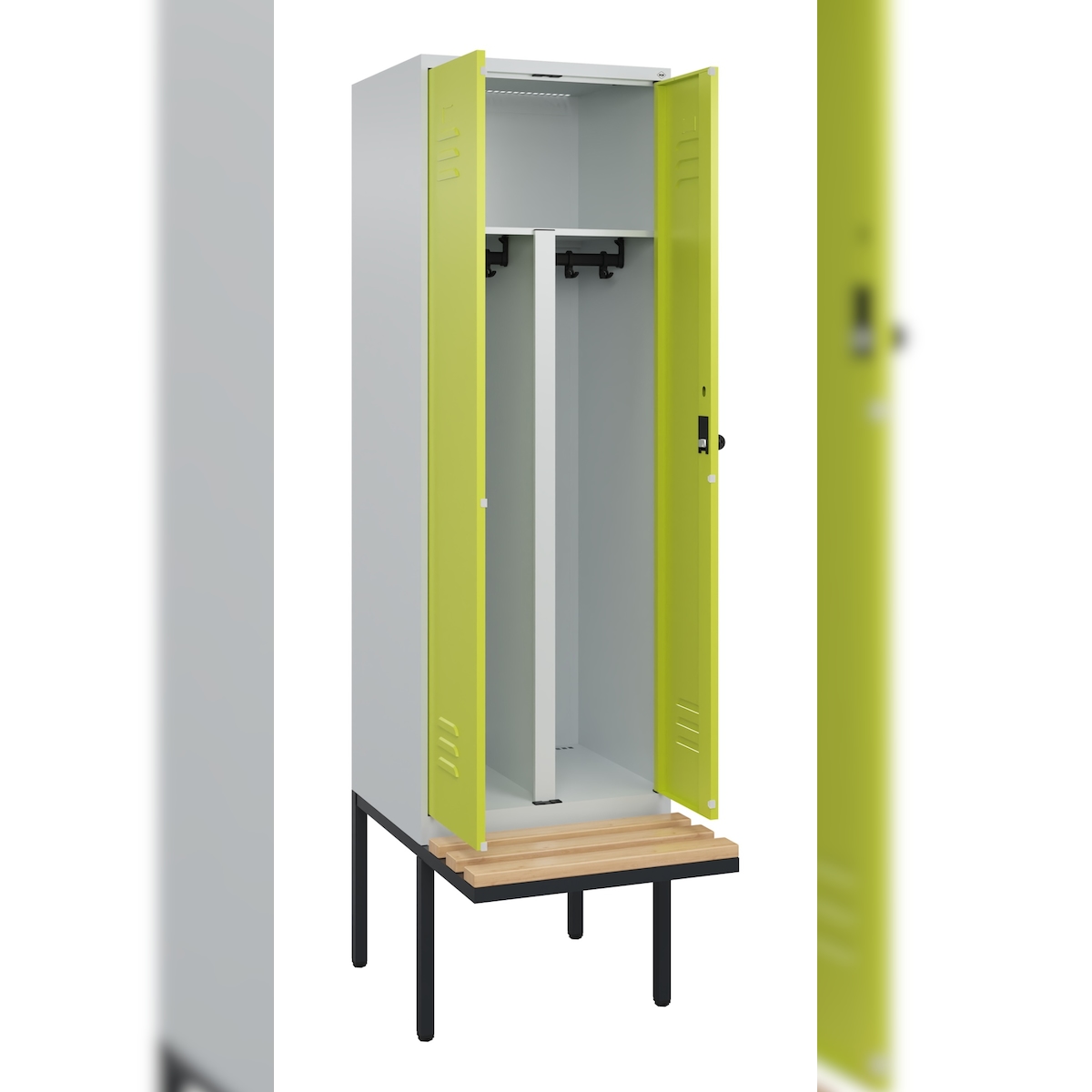 C+P Spind Classic PLUS, schwebender Sitzbank aus Buche 2 Abteile, HxBxT 212x80x82cm, Sicherheitsdrehriegel, Verkehrsweiß von PROREGAL