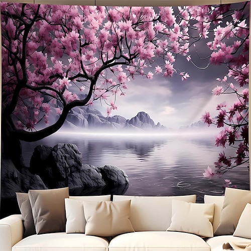 fiori di ciliegio rosa, albero di sakura, lago sereno, montagne, paesaggio zen nebbioso, arazzo da parete, striscione per porta, arredamento per la casa, soggiorno, camera da letto, decorazione,
