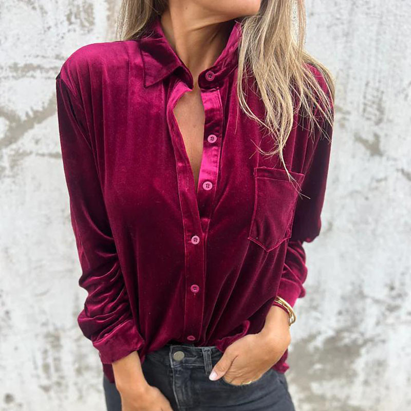 Women's Shirt Velvet Elegant Dressy Solid Color Elegant Stylish Long Sleeve Shirt Collar Regular Tops Work Holiday Going out Pocket Buttons Army Green Fuchsia Brown Spring Fall