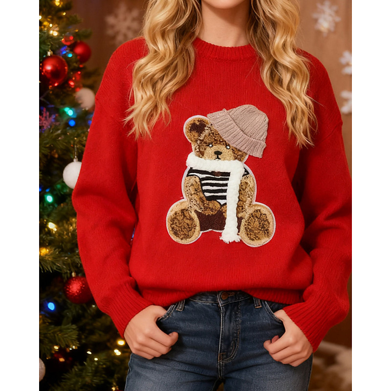 Women's Sweater Pullover Pom Poms Ugly Christmas Gifts Cute Animal Ribbed Crew Neck Knitted Long Sleeve Regular Tops Knit Christmas Outdoor Holiday Red Fall Winter