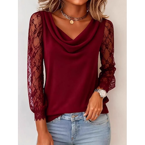Per donna Blusa Tinta unica Elegante Casual Manica Lunga Scollo a Cascata Top Regolari Quotidiano Pizzo Patchwork Nero Bianco Rosa Vino Blu marino Primavera Autunno Inverno